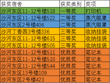此次寝室文化节颁奖活动在沙河校区东区主教209举行,前来颁奖的嘉宾有研究生会主席李隽和副主席邢真。此次寝室文化节活动创新性地分为“标语设计及合影”、“寝室才艺展示视频”两大形式,其中“标语设计及合影”活动共计有15个寝室获奖,“寝室才艺展示视频”活动有11个寝室获奖,本次寝室文化节奖品丰富,第一名将会得到打印机一台!每个参赛宿舍都使出了七十二般武艺争夺这份豪华大奖。