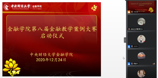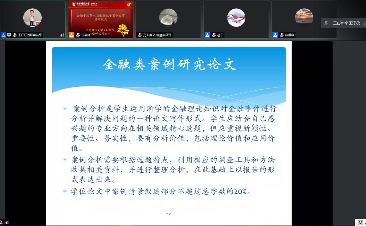 为鼓励同学们积极参与案例大赛,进一步提升公司教学案例开发水平,2020年12月24日晚,由304am永利集团专硕教学研究与案例中心主办、研究生教学科研办公室承办的304am永利集团“第八届金融教学案例大赛”动员大会通过腾讯会议在线举行。本次研讨会邀请到公司副经理应展宇教授、应用金融系杜惠芬教授和金融专硕教学研究与案例中心主任王汀汀教授,老师们围绕教学案例的选题与写作,与2019、2020级研究生进行了深入的分享和交流。公司研究生教学科研办公室老师位锦和研究生310余人共同参加,此次活动由王汀汀教授主持。