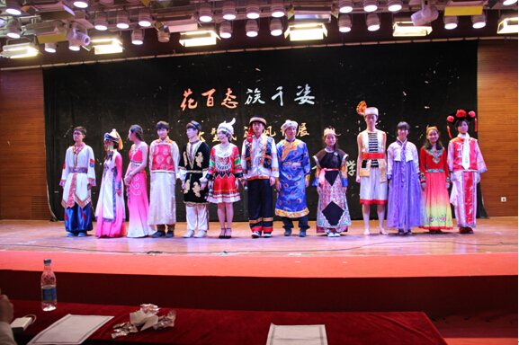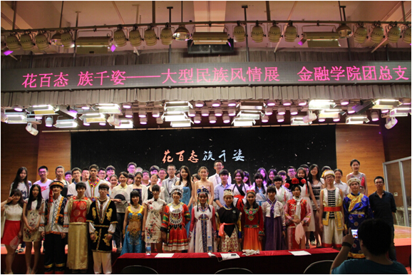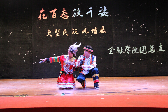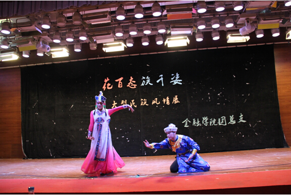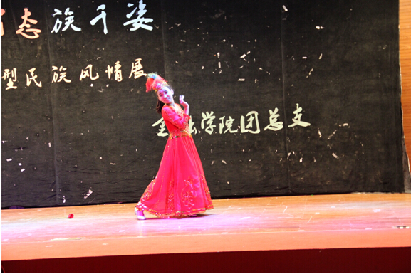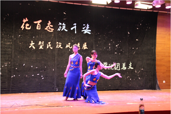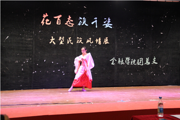 上场的是金融14-1团支部的朗诵《白衣飘飘的年代》,作为文科生的他们在诗意的会场上尽展饱满的才情与细腻的思想。而稍后到来全场展演的高潮——金融14-2支部的历史剧《昭君出塞》则将民族文化融入那充满浪漫气息的历史故事中。饰演画师的周仕磐同学以其充分的入戏和惟妙惟肖的表演技巧引起了观众朋友们的一阵阵掌声,而饰演匈奴单于的田凯辉同学则以他爱好和平、团结友善、 以天下苍生为己任的明君形象,将汉匈两国缔交美好姻缘,世代和平的史诗故事演绎的淋漓尽致,寄寓着对国家和平和民族团结的赞美和祈愿。之后上场的全场重点——由各支部模特组成的特色民族服饰秀更是以精致的服装、优美的舞蹈和多民族共同发展的舞台盛况再次将场上的气氛推至高潮。