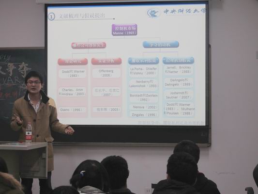 11月21日晚,公司本科生学术讲堂第一期在沙河校区主教学楼303教室举行。在第九届中国金融学年会宣读论文的公司2011级金融学硕士研究生罗昊讲解了《控制权争夺:攫取私利还是治理机制》这篇论文并分享了学术研究经历和老员工涯规划建议,公司员工工作办公室王志梅、2009级优干保研员工邹晓琳以及20余名对此研究方向感兴趣的2011、2012级员工参加了讲座。讲座由金融学术研究会会长冯泽京主持。