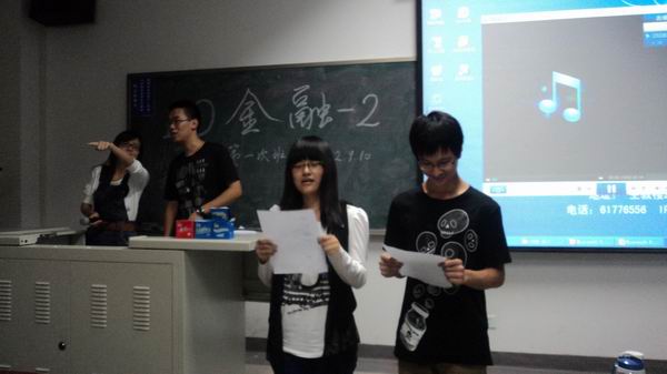 2012年9月10晚上18:30,在主教208教室,2010级金融二班全体同学召开了三年级第一学期的第一次班会。首先班主任王汀汀老师、辅导员谢海燕老师和班级助理武玉婷学姐就本学期的学业课程情况、班级工作情况以及在新学期对同学们的要求和期望等方面分别作了简短发言。