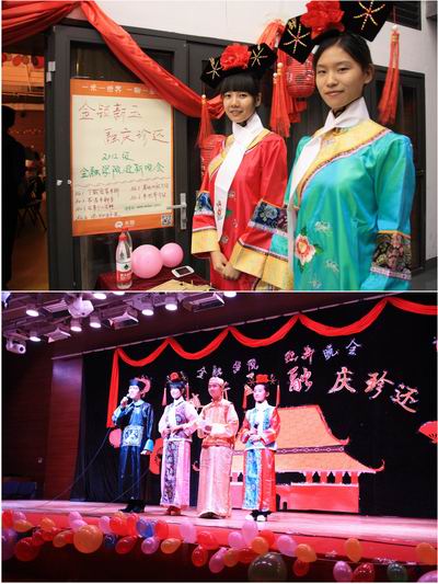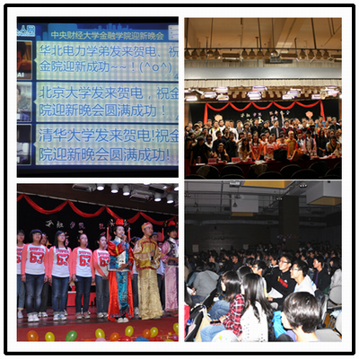 由2012级金融学1班、金融学2班和国际金融班的女生带来的女声合唱《军训的一天》是把新生们带回了难忘的军训岁月。这首在军营里由教官教的歌,饱含了我们对教官、对辅导员、对那段磨练意志的军训生活的深深想念。而2010级金融工程一班的蔡东哲和蒲炜同学则带来了舞蹈串烧《西游记》,用创新的舞蹈,代表大三的学长学姐们,给大一新生们带来了他们的祝福和期待。其后,2011级金融工程2班的同学表演了压轴节目——舞台剧《大学那些事儿》,让我们的大一新生们又对已经慢慢展开的老员工活多了一份期待、也多了一份对过好老员工活的自信。