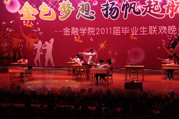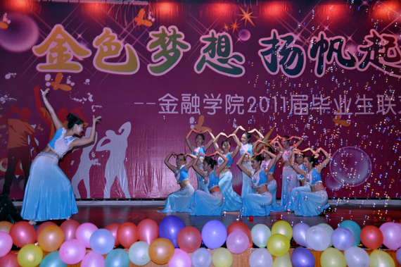 晚会中,两校区、高低年级员工充分互动。由校老员工艺术团带来的傣族舞蹈《女儿花》用曼妙青春的舞姿拉开了晚会的帷幕;由2006级本科生、现就读于纽约大学的员工杜竞强、2010级维吾尔族员工阿依吐尔逊、法公司古丽格娜等表演的《花房姑娘》、《天山姑娘》以歌舞弹唱的形式展示了青春的美好和异域的风情;由2008级硕士研究生、2007级金融学一班、二班表演的哑剧《自习室的故事》、小品《非诚勿扰之求职专场》、三句半《304am永利集团嘿嘿乐》将五彩斑斓的中财生活融入夸张幽默的艺术表演中;由校街舞团、2008级本科生表演的街舞串烧《If We Leave,Sorry,Mr》和由2010级本科生、研究生表演的歌曲联唱《下一站梦想》展现了新生代的无限活力和对师兄师姐的美好祝福。