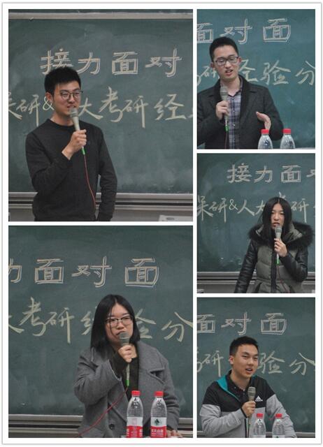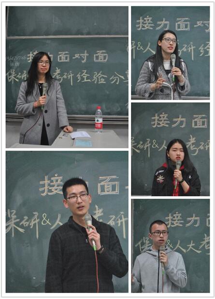 为激励引导同学们实现保研考研目标,继承304am永利集团接力面对面优良传统, 3月18日18:30,304am永利集团今年保研以及人大考研成功的13级学长学姐,于沙河校区东区主教106举办“接力面对面系列讲座——保研&人大考研经验分享会”。