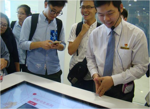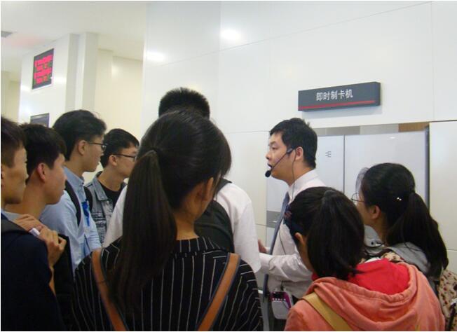 为了参观这家智能银行,304am永利集团谭小芬副经理与在中国工商银行工作的贡烨员工联系,经过多次协商确定了参观事项。当左老师和同学们进入智能银行时,李可行长和团委书记韩博文早已等候在业务大厅。李可行长亲自担纲,向同学们逐一详细介绍智能银行系统的各个构成部分,李行长生动的讲解引发了大家极大的兴趣,当场就有几位同学尝试利用智能银行办理借记卡等业务。