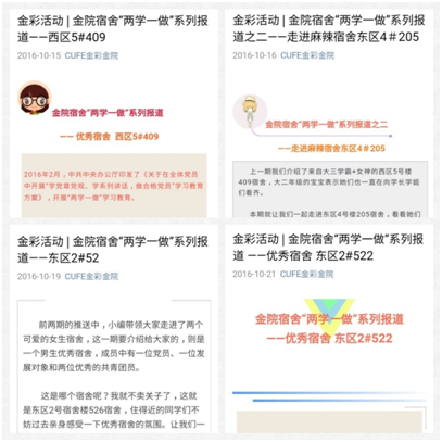 为了充分展展示“两学一做”党员示范宿舍的风采,达到以评促建的示范效果,支部依托“金彩金院”订阅号开展了示范宿舍的系列风采展示活动,从两学一做、学风学业、文化建设、课外活动、宿舍凝聚力等多个方面充分展现了当代共产党员在宿舍建设中的引领作用。