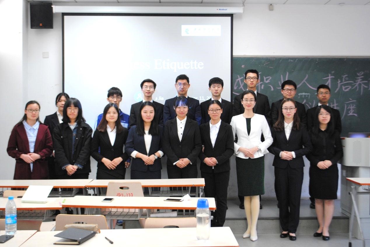 本次讲座在欢乐温馨的氛围中结束,同学们与贾老师合影留念并针对自己的疑问与老师进行了交流。通过此次商务礼仪专题讲座,同学们不仅了解了商务礼仪的基本知识,同时对未来职场的人际关系有了更多的启发。