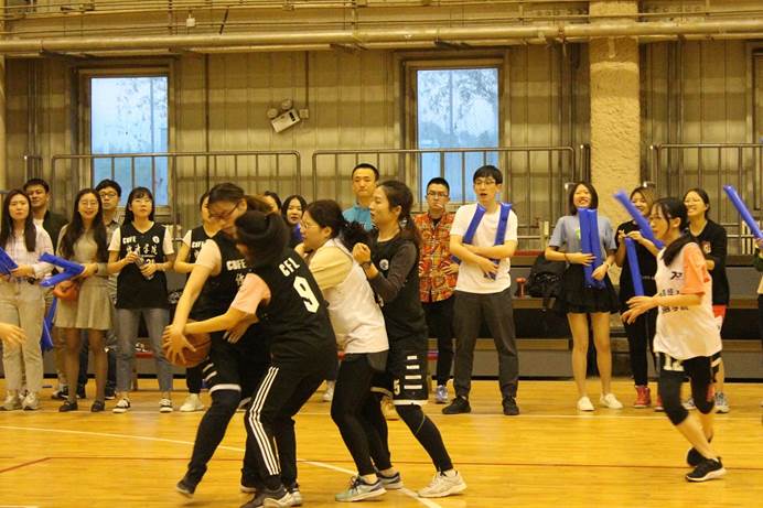 一声哨下,比赛正式开始。金院女生率先进入状态,在几轮攻防之后,女篮队员王晶篮下投篮,赢得了开局第一球,现场助威的男女同学加油喝彩声伴随着这开局的势如破竹此起彼伏。