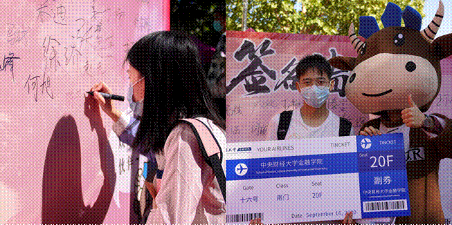 在老师们和志愿者们的带领下,新生们圆满地完成了一系列流程,小萌新们在签名板上签下名字并与金院吉祥物金小融合影留念,以容光焕发的精神面貌开启了人生的新篇章。