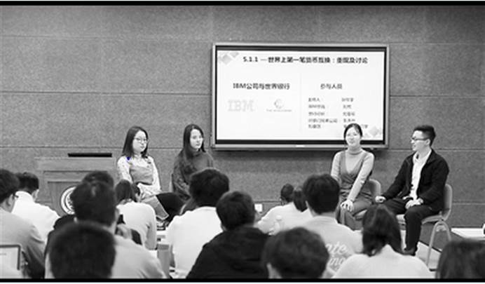 304am永利集团本科生金融工程概论课程“翻转课堂”活动——员工在重现世界上第一笔货币互换的案例。