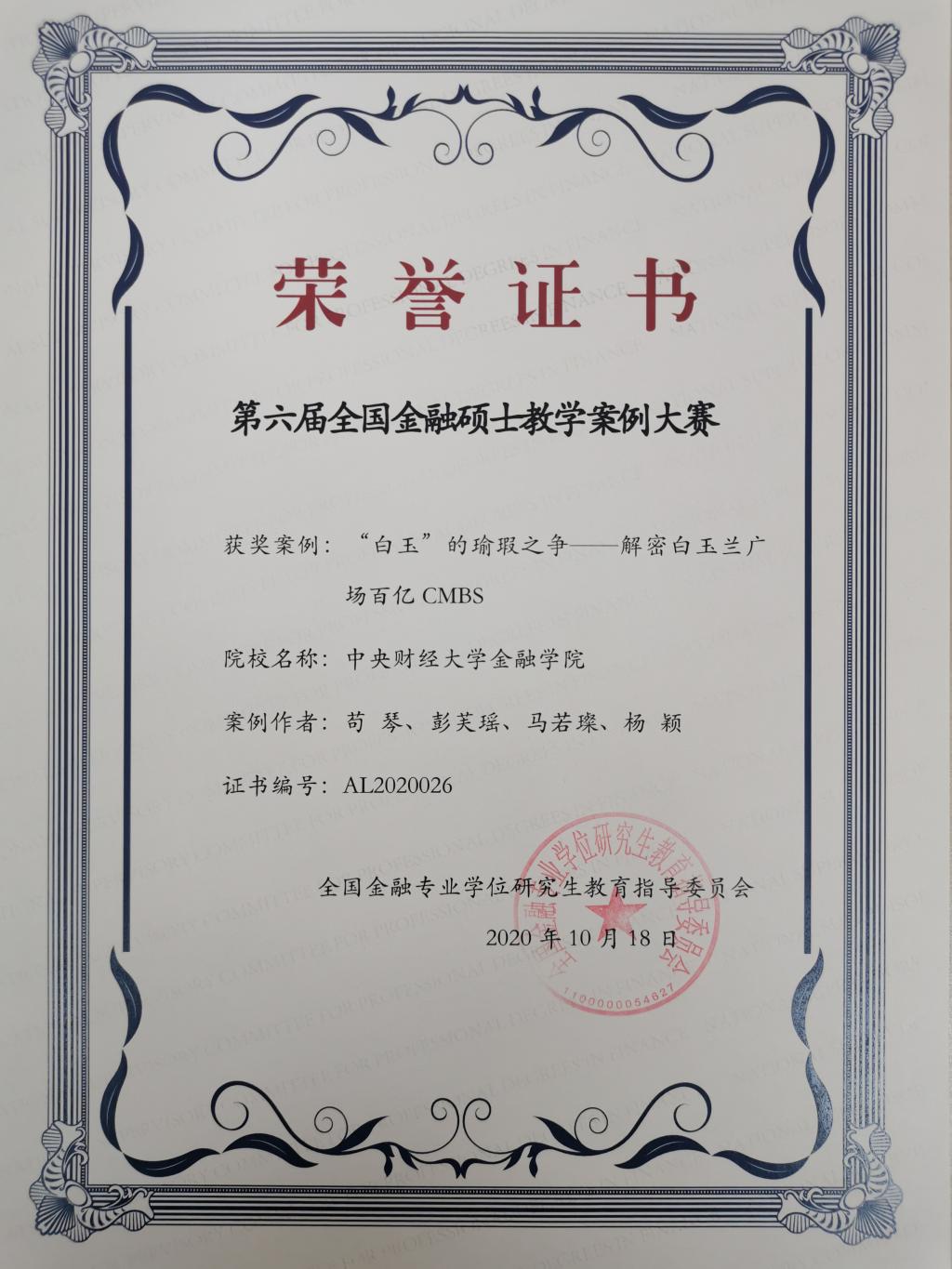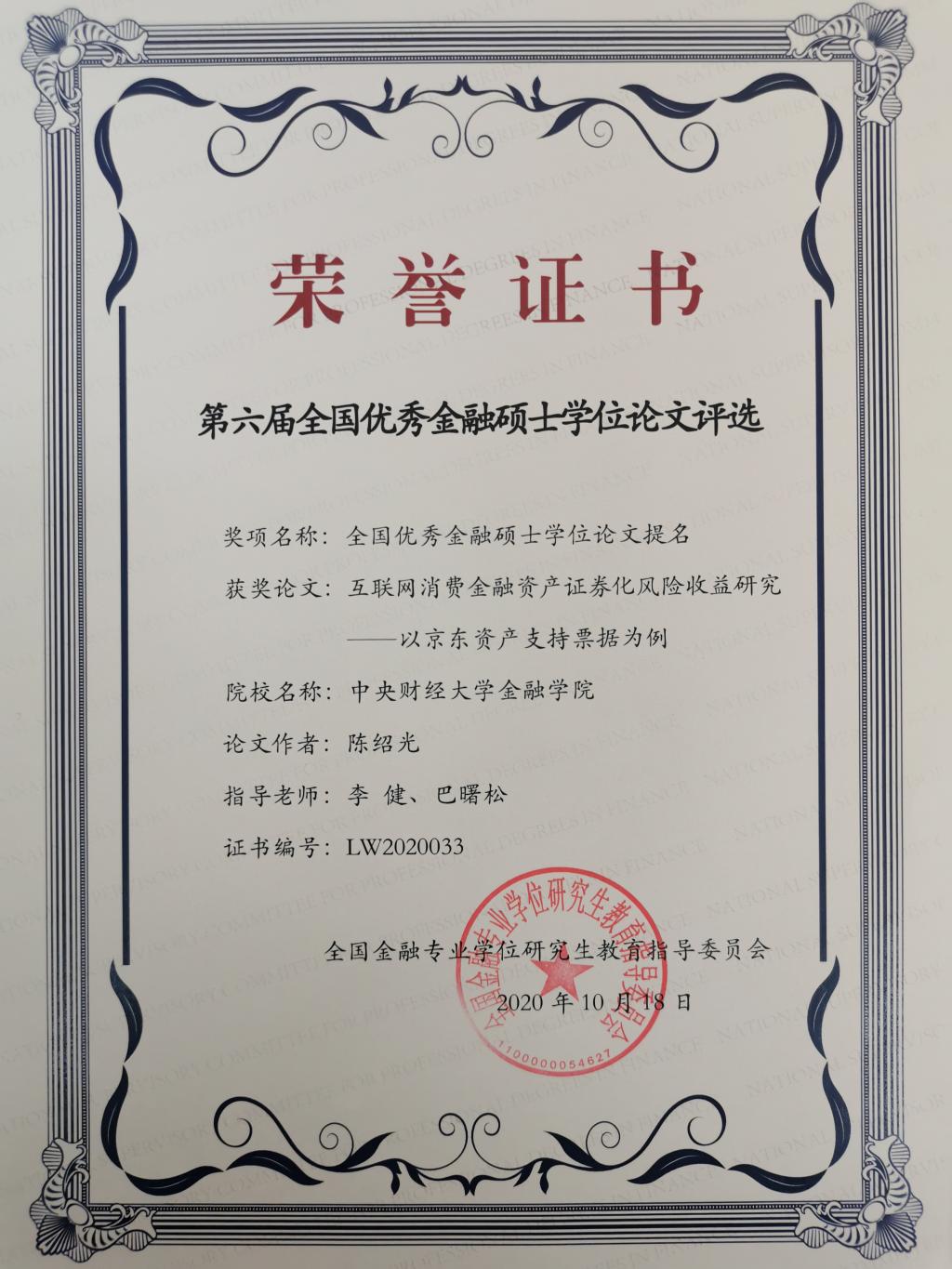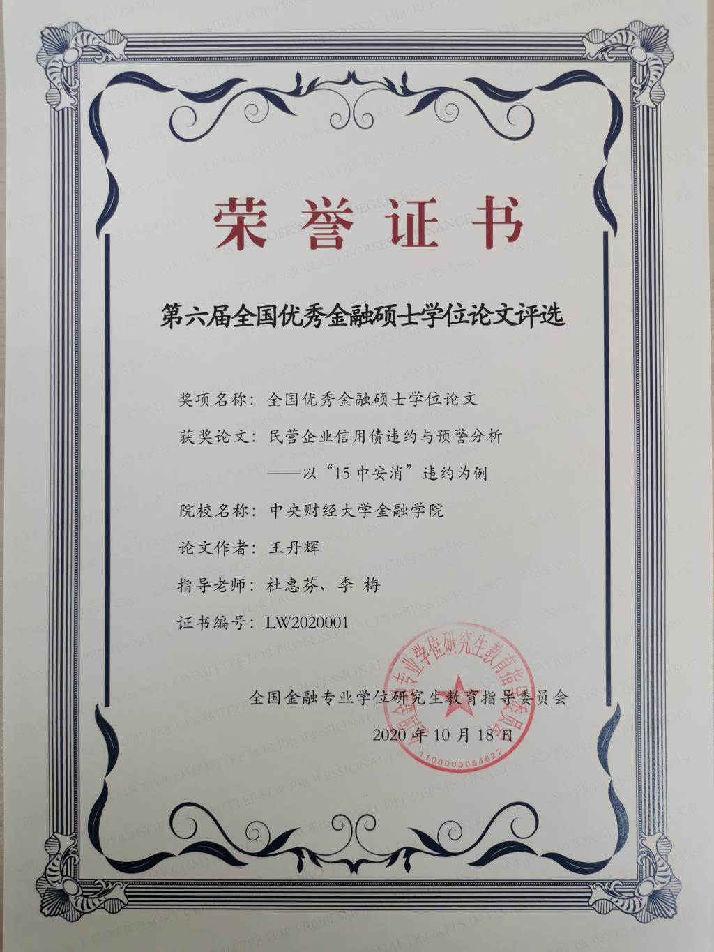 毕业生王丹辉的《民营企业信用债违约与预警分析——以“15中安消”违约为例》(指导教师:杜惠芬、李梅)获全国金融硕士优秀学位论文奖;毕业生陈绍光的《互联网消费金融资产证券化风险收益研究 ——以京东资产支持票据为例》(指导教师:李健、巴曙松)获全国金融硕士优秀学位论文提名奖。