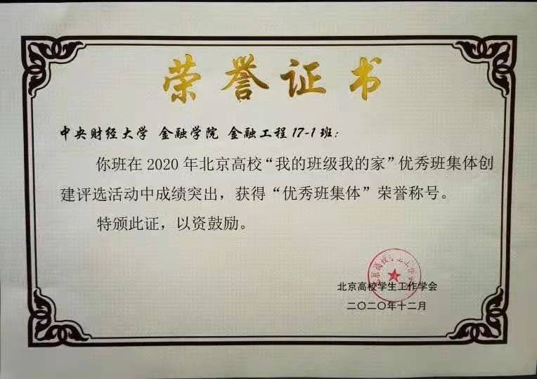 本年度,2017金融工程1班荣获北京高校“我的班级我的家”优秀班集体称号;2018级金融工程2班获评北京市先锋杯优秀团支部;2018级金融学硕阮志朋荣获“北京市三好员工”、2017级金融工程1班孙维嘉荣获“北京市优秀员工干部”。本科生第一党支部、博士生党支部获评学校首批党建工作样板支部;2018级金融工程1、2班班获评学校五四红旗团支部;梅琪老师获评学校“十佳辅导员”,吴偎立、商有光、陈锐获评学校“优秀班主任”。