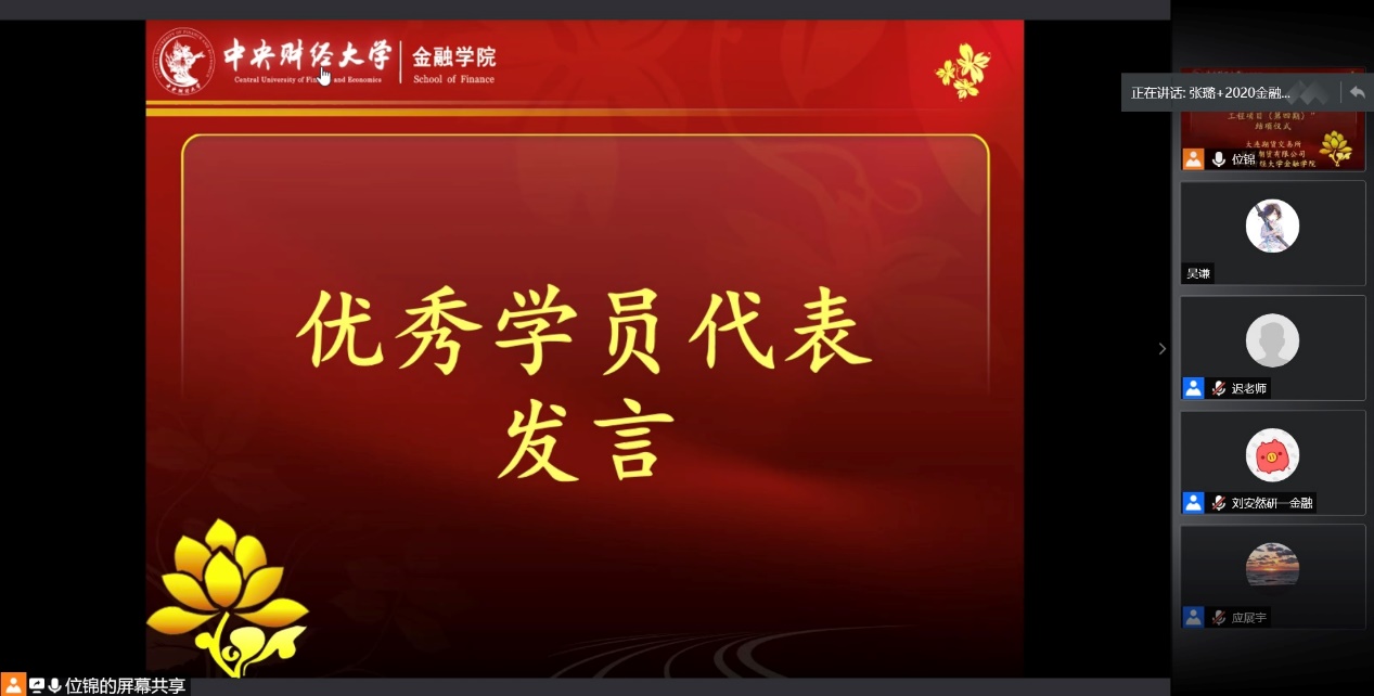 接下来,位锦老师宣读了本期项目的奖学金学员、优秀学员和交易优胜奖学员名单,并邀请了获奖代表——於帆、张璐、朱丽华、景观四位同学分享了学习收获和交易心得。