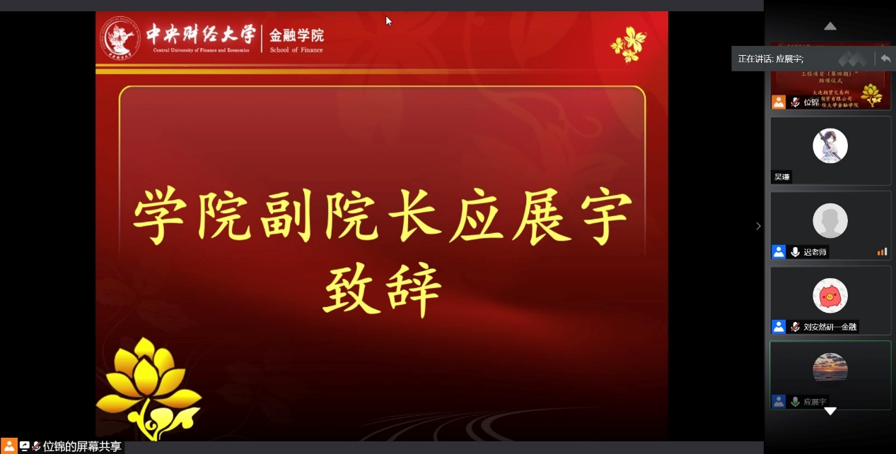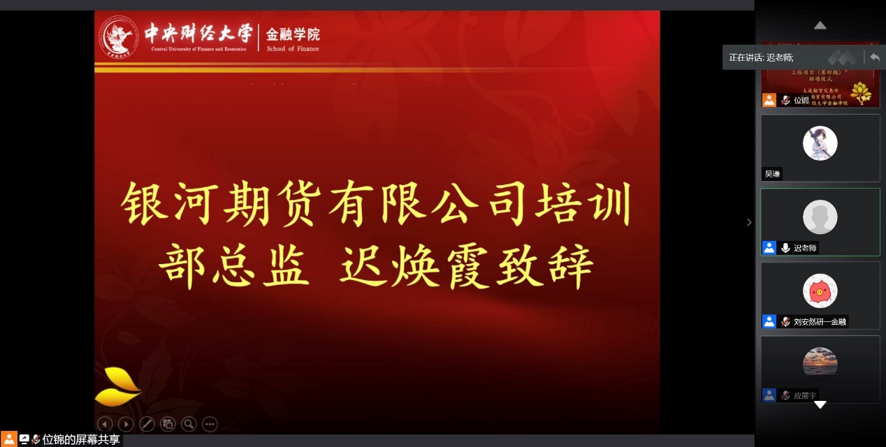 公司副经理应展宇教授对项目致辞。他指出高校期货人才培育工程项目是产教融合、院企合作的典范,感谢大连商品交易所、银河期货有限公司在授课团队、软件设施及奖学金等方面的大力支持;此项目的顺利推进,离不开公司老师们的对接、沟通与协助,感谢他们的辛勤付出;本期项目历时3个月,通过理论学习、模拟实操、考试测验等环节同学们均已达到结项要求,对此表示祝贺,并希望同学们以此为契机,保持对专业知识的兴趣,利用各种方式提升自己的专业素养。