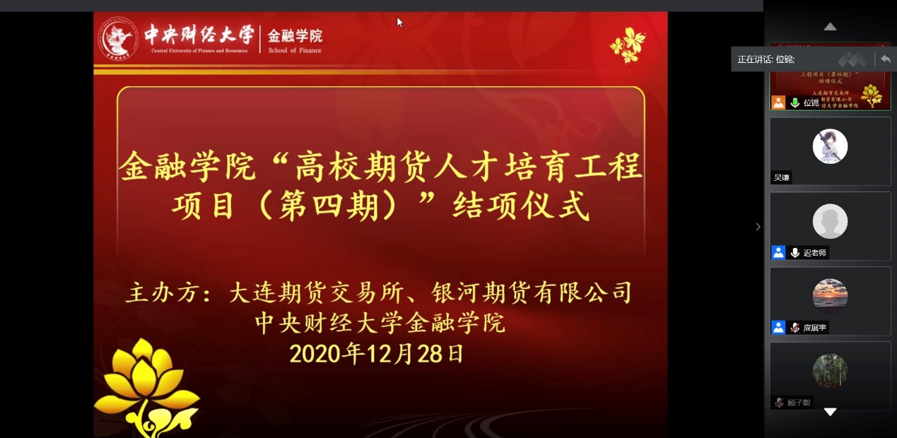2020年12月28日晚,公司与大连期货交易所、银河期货有限公司共同主办的“高校期货人才培育工程项目(第四期)”结项仪式通过线上腾讯会议圆满完成。公司副经理应展宇教授、银河期货有限公司培训部总监迟焕霞女士和高校期货人才培育工程项目(第四期)学员们出席了此次结项仪式。本次活动由公司研究生教学科研办公室老师位锦主持。