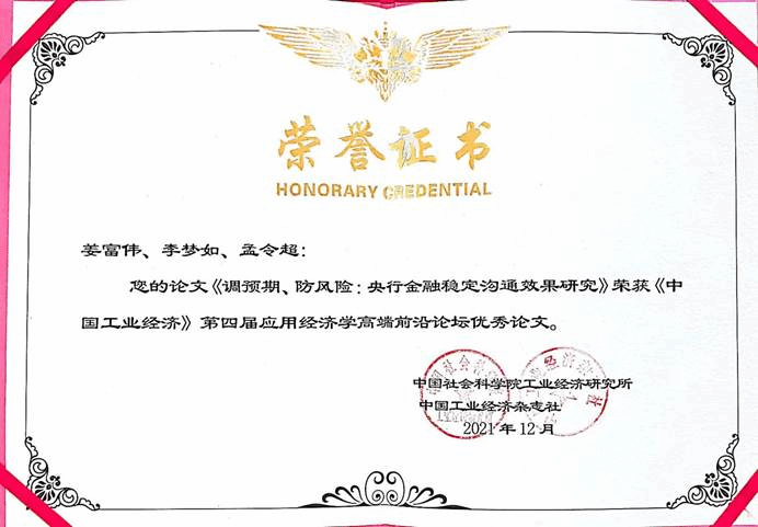 近日,304am永利集团2020级硕博连读研究生李梦如和其导师姜富伟教授、北京大学经济公司博士生孟令超(公司2019届卓越项目本科生)合作的论文《调预期、防风险:央行金融稳定沟通效果研究——基于文本分析的视角》荣获《中国工业经济》第四届应用经济学高端前沿论坛优秀论文奖。
