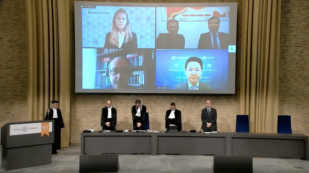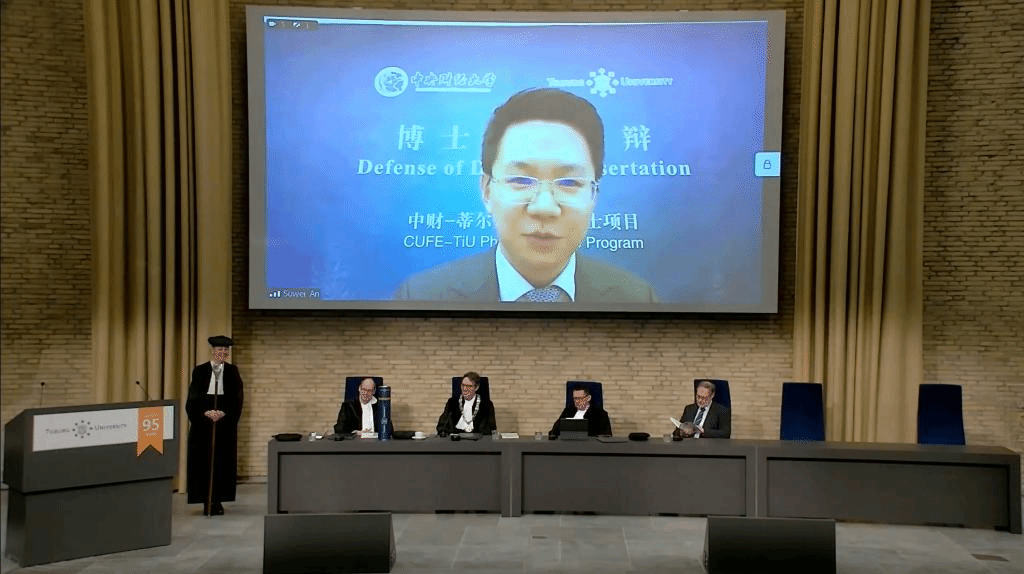 2023年2月17日,中财-蒂尔堡项目博士生学位论文公开答辩仪式在蒂尔堡大学Aula大礼堂举行。公司蒂尔堡项目2018级博士生安苏伟在线进行了公开答辩,其导师荷兰蒂尔堡大学Lieven Baele教授、谭小芬教授、吴锴副教授,以及博士委员会成员安特卫普大学Marc Deloof教授、马斯特里赫特大学Rachel Pownall教授、蒂尔堡大学Frans de Roon教授和Peter de Goeij副教授均参加了答辩仪式。