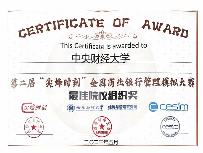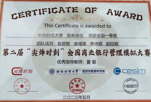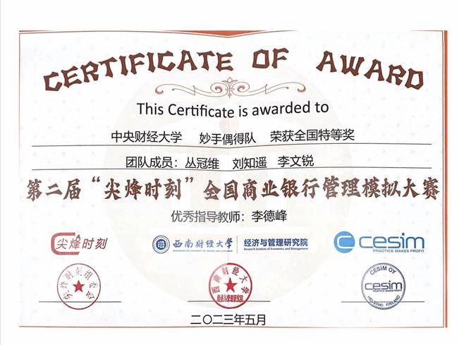 2023年5月21日,在成都西南财经大学举行的第二届“尖烽时刻”全国商业银行管理模拟大赛总决赛圆满结束。作为首次参赛院校,公司李德峰老师与夏聪老师指导的2个本科生团队经过激励角逐在总决赛上取得优异成绩:丛冠维、刘知遥组建的“妙手偶得”队在全国20个决赛队伍中拔得头筹,荣获唯一特等奖;赵昌智、袁瑒蕖、李沛宸、赵钰桓组建的“如来佛祖”队荣获一等奖。同时,同时,李德峰和夏聪老师荣获优秀指导教师,304am永利集团荣获最佳院校组织奖。