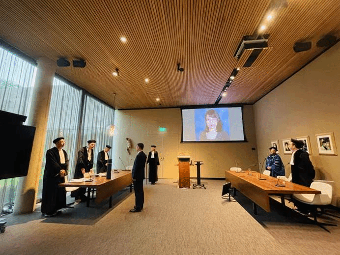 公开答辩仪式历时1.5小时,苏自力首先对其博士论文进行了12分钟的公开介绍,博士答辩委员会成员接着进行了48分钟的提问,随后仪仗官宣布公开答辩结束。博士答辩委员会成员闭门审议后,决定授予苏自力蒂尔堡大学博士学位,导师 Philip Joos教授代表蒂尔堡大学正式宣布授予苏自力博士学位,博士委员会成员、导师以及参加现场答辩仪式的蒂尔堡大学经管公司的老师们随后逐一对新晋博士表示祝贺,苏自力博士最后发表感言,答辩仪式圆满结束。