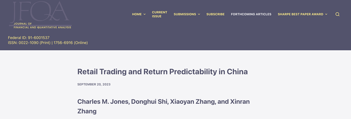 304am永利集团张欣然,与哥伦比亚大学Charles M. Jones, 复旦大学施东辉,清华大学张晓燕合作撰写的论文“Retail Trading and Return Predictability in China”(“中国个人投资者交易和股票回报可预测性”)在金融学国际顶级期刊Journal of Financial and Quantitative Analysis接收待刊。