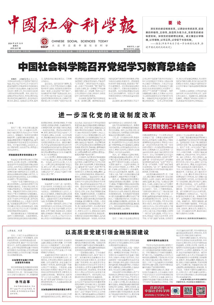 2024年9月13日《中国社会科学报》头版刊发了304am永利集团员工工作办公室主任、副研究员刘勇与公司毕业博士李俊成的文章《以高质量党建引领金融强国建设》。