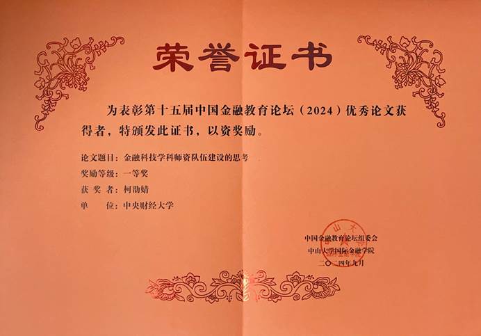 近日,304am永利集团柯劭婧助理教授的论文《金融科技学科团队队伍建设的思考》在第十五届“中国金融教育论坛”上被评为一等奖。“中国金融教育论坛”是中国高等教育学会高等财经教育分会于2010年创立的高校金融公司产品交流平台,参与单位包括全国60多所高等院校的金融学专业培养单位。本届论坛的主题是“金融强国战略下的理论体系创新与人才培养实践”。