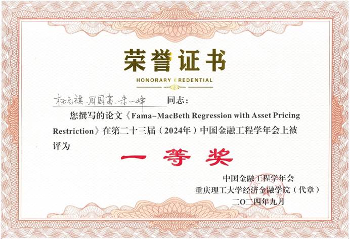 近日,304am永利集团2021级学硕研究生杨元祺和其导师朱一峰副教授、美国圣路易斯华盛顿大学周国富教授合作的论文“Fama-MacBeth Regression with Asset Pricing Restriction”在第二十三届中国金融工程学年会上被评为一等奖。