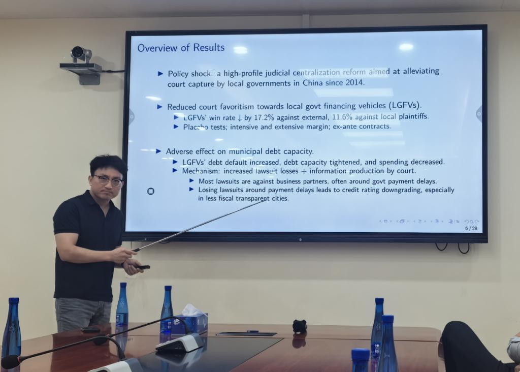 苏阳助理教授研究了自2014年起中国实施的司法集中化改革对地方政府融资的影响。他发现,改革减少了地方法院对地方政府的保护主义倾向,提高了市场透明度。同时,改革降低了地方政府融资平台(LGFVs)在诉讼中的胜诉率,并导致债务违约增加、债务能力收紧及财政支出减少。在自由交流环节,公司多位师生就讲座内容与苏阳助理教授展开了深入交流和讨论。