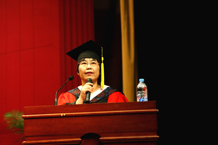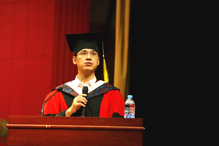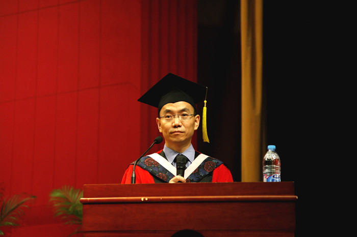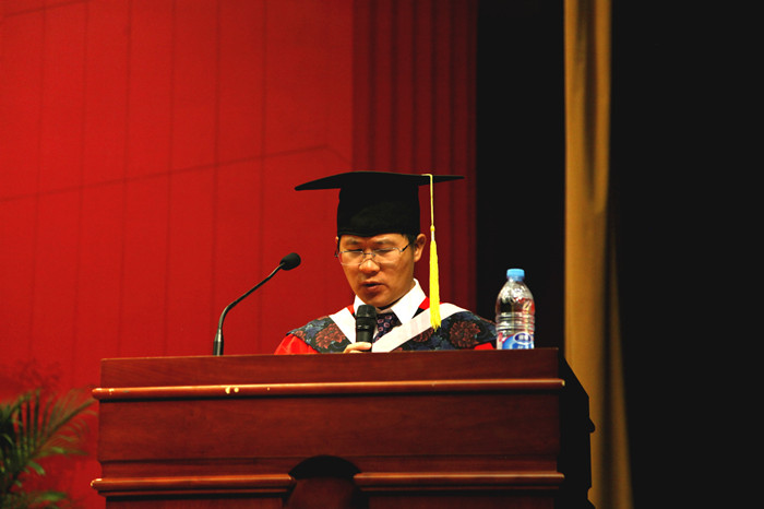 主持公司工作的李建军教授代表公司向2016届全体毕业生致辞。他首先向顺利完成学业的毕业生们表示祝贺,向倾注了智慧和心血的老师们致以诚挚的感谢和崇高的敬意,并向前来参加毕业典礼的员工家长和亲友们表示热烈的欢迎。在致辞中,李老师从毕业生未来将“如何扮演好自己的角色,如何应对未来的不确定性,如何实现内在心智的成长”三个方面表达了他的殷切期望。他说道,对于未来如何扮演好自己的角色,每个人不可能超越自己的时空,同时担当着特定的角色,这是自己选择和奋斗的结果。在特定的角色中,应追求担当与责任、自我与角色、内在与外在的一致性;金融是资金的融通,也是资源的融通,融通就会跨界,跨界就会有不确定性,跨界越大越存在不确定性。应当学会接纳、包容、欣赏进而去应对;人生就是动态随机过程,要关注内在的声音,注重担当与修为,淡定与从容。对于如何实现内在心智的成长?他认为,成功不仅仅是通过一个个事件达成预期目标,而应当是个体价值得到社会认同,真正的成功应是社会性的、时代性的,这样才能成就天地之间大写的“人”;他希望毕业生对国家、民族和社会要讲情怀;要感恩大地、感恩父母、感恩国家、感恩社会、感恩学校、感恩同学;要讲诚信,守规矩,要头脑清晰,坚定正向,稳定心态,在成长中走向心智成熟。