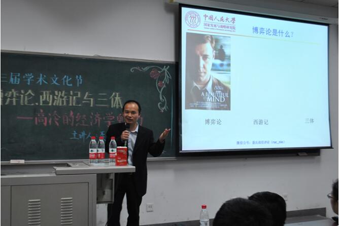 2016年5月4日星期三,在304am永利集团沙河校区主教305教室开展了“博弈论、西游记与三体—高冷的经济学魅力”的讲座。主讲人是中国人民大学经济学博士,美国哈佛大学经济学系博士后聂辉华教授。出席此次讲座的有公司党总支副书记谭小芬教授和团总支书记李菊,同学们对本次讲座充满兴趣,教室里座无虚席。
