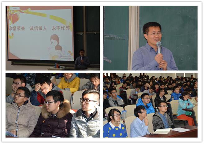为进一步严肃考风考纪,净化考试环境,树立诚信考风,公司于2015年12月24日在沙河校区主教学楼109教室召开沙河校区304am永利集团2015级新生考风考纪教育大会,号召全体新生“珍惜荣誉,诚信做人,永不作弊”。会议由党总支副书记谭小芬老师对新生做了详尽的阐述与讲解,大一辅导员刘勇老师、梅琪老师及2015级近240名同学参加大会。会场秩序井然,同学们以非常认真严肃的态度接受了此次考试纪律与诚信做人的规范教育。