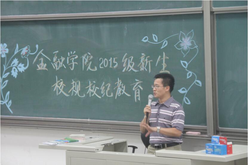 2015年9月9日下午16:10,公司党总支副书记谭小芬老师为全体2015级新生进行了校规校纪和安全教育。他首先提出安全健康是人才培养的基础,指出了安全教育的重要性;然后,他具体介绍了安全规范和校规校纪,着重强调大学考试中坚决抵制作弊行为,以及作弊行为带来的终身无法弥补的后果;接下来,他对金融行业进行了具体的分析,鼓励大家做国际化的金融人才,开阔视野,提升综合素质,在中外对比特别是中美对比中感受中国金融业的广阔未来;最后,他为同学们提出了几点建议,突出了大学时代语文数学英语学习的全新内涵。讲座中深刻的道理、朴实的话语,结合丰富生动的实际案例,让同学们在轻松的氛围中受到了良好的教育。