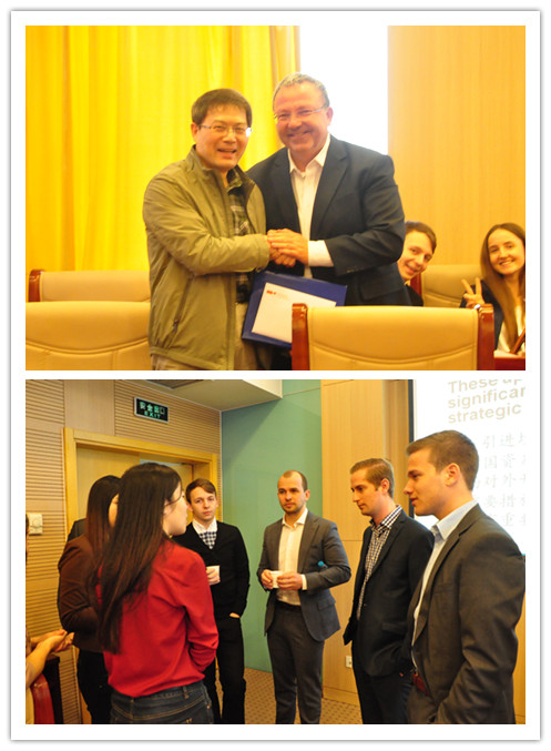 在论坛交流阶段,中外师生一起就论坛主题进行了热烈地讨论。公司贾宏晶,徐娅欣,贾小安,强文芸等同学分别就“利率市场化”,“亚投行”,“新三板市场”,“存款保险制度”等热点问题与对方同学做了交流,会场气氛热烈。最后傅强副教授对本讲座进行了总结,并与Marco J.教授交换了礼物,期待未来双方举办更多的师生学术交流活动。