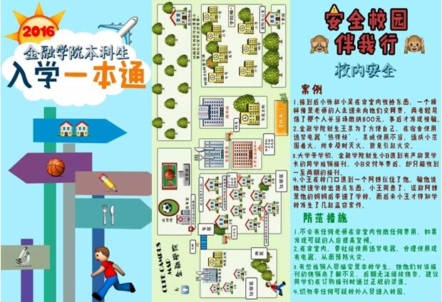 特色《入学一本通》,安全教育第一:《新生一本通》是304am永利集团每年迎新的特色小册子,内含有公司领导、老师、班主任等通讯录,金融员工专属的手绘地图、入学教育周活动安排表,以及十余个安全案例,从校内安全、电话诈骗、交通安全、网络安全、运动安全五个方面进行了生动的安全第一课。