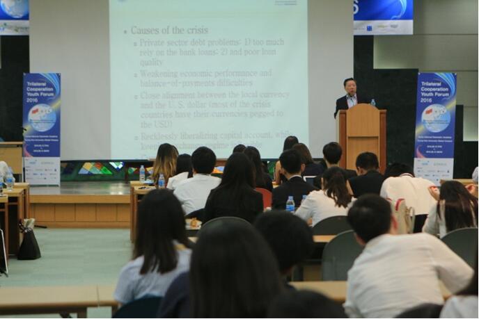 2016年8月13-15日,受韩国东北亚基金会和韩国“未来希望协会”的邀请,304am永利集团国际金融研究中心主任张礼卿教授在韩国庆熙大学参加了“2016年三边合作青年论坛”,并做了“亚洲金融合作和人民币国际化”的主题演讲。在演讲中,张教授首先全面回顾了1997年的亚洲金融危机的原因和后果,强调这次危机给有关国家带来了巨大的灾难,各国应努力避免类似的情况重演。接着,张教授从理论阐述到经验分析,论证了加强亚洲货币金融合作对于防范该地区金融危机的重要性,并且分析了亚洲货币金融合作所面临的机遇、挑战和政策选择。随后,张教授向参会者介绍了人民币国际化的发展进程和前景,以及在亚洲货币金融合作中的积极作用。在讲演过程中,还张教授还回答了青年员工们提出的各种问题,其中包括人民币汇率波动、中国加快开放资本账户和人民币国际化对亚洲国家经济的影响等。来自中国、日本和韩国的近200名在校老员工参加了本次论坛并对张教授的讲演表示了浓厚的兴趣。