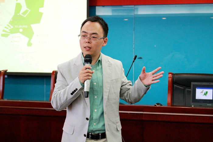 付俊伟副教授对蒂尔堡市和蒂尔堡大学的基本情况作了详细介绍。他提到,蒂尔堡大学由6个公司组成,有来自100多个国家的12399名员工在这里学习。根据2016-2017年泰晤士高等教育(THE)专业排名,蒂尔堡大学经济学与商科位列全球第 11 位,欧洲第三位。为了让大家进一步了解蒂尔堡大学,付老师还和大家分享了蒂尔堡大学的宣传片和宣传册。