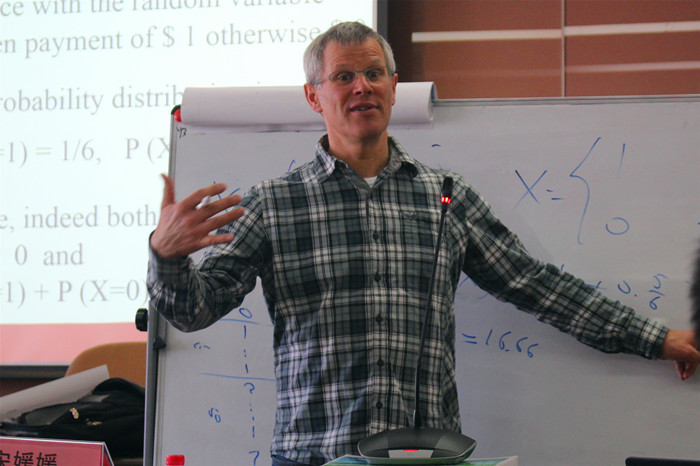 在为期五天的教学中,课程安排紧凑有序。基础理论与计算机运用相结合,同学们受益良多。Herbert Hamers教授首先讲授了基础的数学与统计学理论,并以荷兰银行分布和银行开户数据为例检验两变量之间的相关关系,测算两变量之间的协方差和相关系数。教授结合资本资产定价模型来讲解简单线性回归如何通过Excel软件进行实现;以马科维茨的证券投资组合理论为例说明了如何计算随机变量的期望、方差,并介绍了中心极限定理、正态分布、切比雪夫不等式等重要统计学知识。在打下扎实的数理统计学知识后,教授讲解了如何实现回归方程以及如何用回归方程进行预测,并将简单线性回归模型扩展到逻辑回归模型、多元线性回归模型以及时间序列模型等。