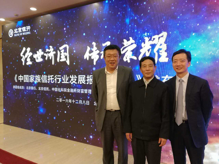 由公司中国银行业研究中心联合北京银行、北京国际信托、中国社会科公司金融研究所合作编写的《中国家族信托行业发展报告(2016)》(以下简称《报告》)于12月8日正式发布,这是国内首份权威的家族信托行业研究报告。王广谦董事长出席了报告发布会,一同出席的领导和专家还有中国社会科公司学部委员、国家金融与发展实验室理事长李扬,中国银行业协会党委书记、专职副会长潘光伟,中国信托业协会副秘书长郑方,北京银行董事长闫冰竹,行长张东宁,北京国际信托董事长李民吉,副董事长、总经理等相关机构的领导、专家,发布会由北京银行副行长冯丽华主持。