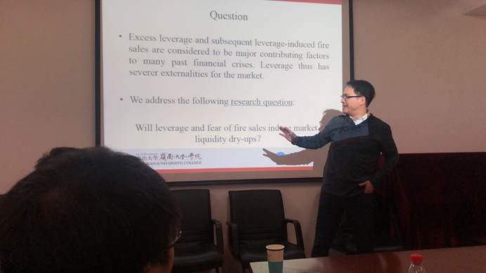 JeremyGoh教授以“Do’sand Don’ts in the Publication Process”为主题进行了分享。他以具体的研究方法、实践研究为切入点,提出了能否发表的三个关键点:研究问题是否有趣,能否讲述一个有吸引力的故事;研究是否具有强有力的理论背景;研究是否具有投资和政策方面的含义。最后,JeremyGoh教授结合自己最近的一篇研究成果,详细介绍了从写作动机、研究构思、论文写作、期刊投稿一系列过程中需要注意的地方。最后,曹夏平教授做了题为“MarketLiquidity Effect of Leverage Prior to Fire Sales”的专题报告。他的演讲深入浅出,结合案例使复杂的问题变得简单易懂,获得在座师生的阵阵掌声。