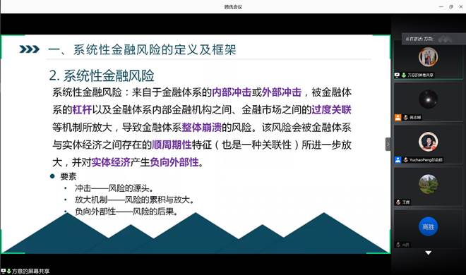 为更好发挥中财大财经智库的作用,加强中心专家的校内交流和协作,在国家金融安全教育部工程中心主任会议的倡导下,国家金融安全教育部工程中心近期举办了第四期中财金融智库云会议。第四期会议主要围绕“金融系统性风险的防范与治理”展开。云会议于2020年7月3日9:00-12:00举行。出席本次会议的学者有:工程中心主任李建军教授、管理科学与工程公司副经理王金亭教授、信息公司副经理王秀利教授、304am永利集团副经理王辉教授、304am永利集团方意副教授、统计与数学公司孙志猛教授、信息公司高胜副教授、管理科学与工程公司荆中博副教授,以及金融安全工程北京市高精尖学科团队、国家金融安全教育部工程中心团队成员全体成员60余人,黄志刚教授主持了会议,李建军主任做了总结性评述。