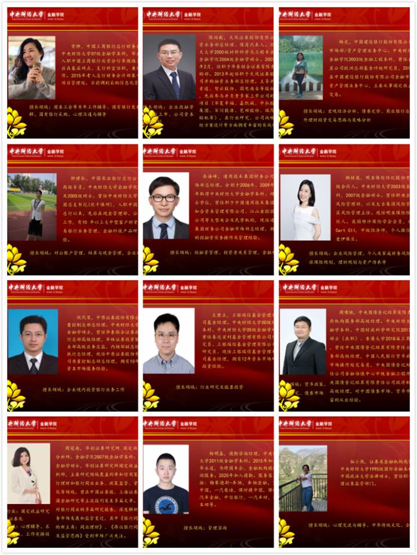 接下来,12位员工导师分享了他们的宝贵的人生经历、从业经验和对同学们的期望,介绍了疫情下金融领域的状况及对同学们职业发展的建议。贡烨员工强调在职业的选择中要明确自身目标、求职方向,然后她对银行中不同类型的工作进行了详细介绍,希望同学们扎实理论基础,在校期间多积累知识;陈培毅员工介绍了大资管时代下要用资源配置的角度看问题,他认为专业是安身立命之本,鼓励同学们在校多读书、开拓视野、关注社会、联系实际、深入思考;杨光员工给同学们提出三点建议,一是探索自己兴趣、树立正确价值观、认识自身能力,二是选择一个大的发展平台,不轻言放弃,三是要有舍有得,学会人生加减法;钟珺弘员工以自身的小故事入手提出了职场六种习惯,即主动融入企业文化、为了对方而写作、会沟通善表达、建立逆商、形象规划、思维突破,她希望同学们具有扎实的文字功底、增强人际沟通能力;岳海峰员工强调了综合素养的重要性,建议同学们大量阅读,读万卷书行万里路,以兴趣助推成长,加强和老师同学的交流,参加公益活动,拓展思维视角;韩桂英员工认为同学们要不断发现自我,寻找职业目标,增强内蓄力,做出终身学习的准备,提高自我管理能力;倪代荣员工介绍了投行的人才需求,并结合自己十多年的资本市场经验,建议同学们在学习的过程中多追问原因,关注事物的合理性;王君正员工分别针对在校期间学习、职业选择、目前资本市场情况三方面进行介绍,强调培养学习能力和认真态度的重要性,他建议同学们利用好寒暑假,在实习中发现自己的职业兴趣;周啸驰员工以欧洲宗教改革的故事、京东白条ABS等具体案例讲述金融科技的发展和应用,鼓励同学们增强自身能力,勇敢面对未来挑战;周冠南员工建议同学们珍惜实习机会,在实习中多学、多听、多问、多思考,了解行业、部门的实际情况,关注资本市场近期动态;杨明鑫员工详细介绍咨询业的发展、工作价值、人才需求,以切身经历向同学们讲述了咨询职业的发展路径、成为咨询从业者的方法等,建议同学们培养独立思考的能力,积极主动的精神,认真工作的态度;拓小燕员工深刻剖析了自己的职业生涯,鼓励同学们提升理论素养和专业技能,深度阅读经典著作,关注行业的发展,更要做靠谱踏实的人,开阔自身的格局与胸怀。