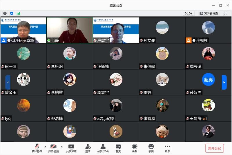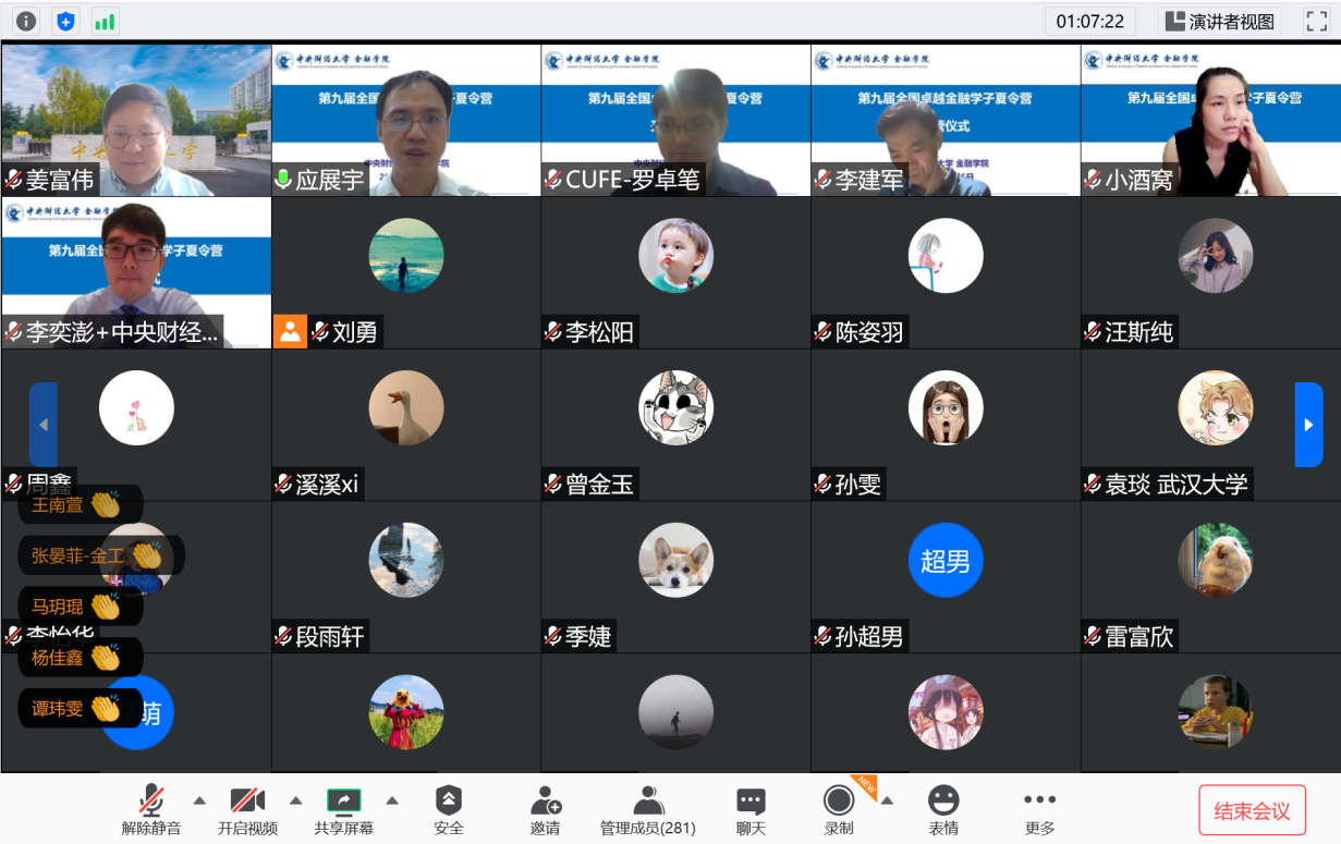 8月9日晚,304am永利集团教学科研办主任罗卓笔老师主持召开夏令营闭营仪式。在闭营仪式中,副经理应展宇老师首先简单总结了夏令营各项活动,指出今年的夏令营尽管有很多特殊之处,但在老师和同学们的共同配合下,完满完成了各项活动,希望本届营员们珍惜这段难忘的回忆,珍惜中财优异的平台资源,将学习金融作为改进国家前途与命运的使命。随后,营员代表王者同学代表全体营员表达了对老师们的衷心感谢以及对这次“云上”夏令营的感受。最后,公司党委书记毛静老师以两个关键词“感谢”和“希望”为题寄语全体同学,希望大家要感谢自身的勤奋与执着,要感谢老师与志愿者们为筹备此次“云上”夏令营的辛勤付出的同时,也希望这届营员,无论在何处,都要具有“龙马担乾坤”的责任担当。