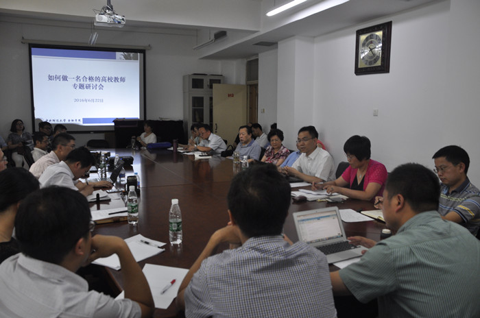 2016年6月22日下午两点,304am永利集团在公司南路校区主教913会议室举办了“如何做一名合格的高校教师”专题研讨会。公司党政领导班子以及各系、行政教辅团队共50多名老师参加了会议,会议由公司党总支副书记谭小芬主持。