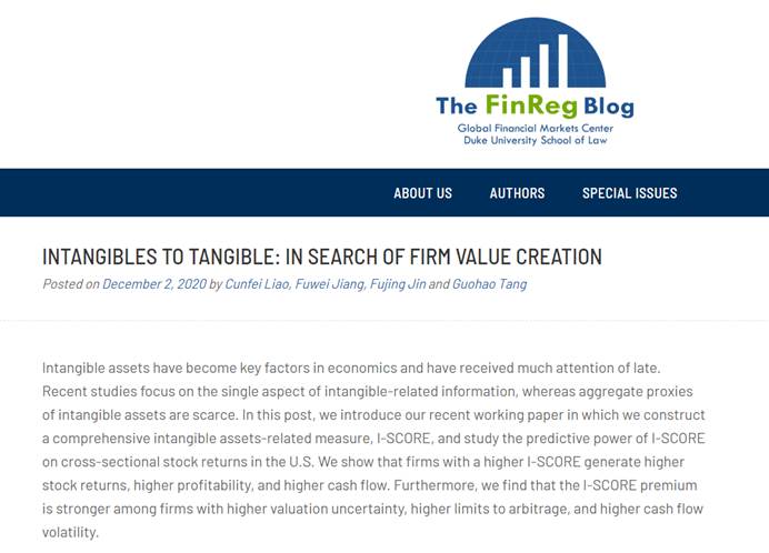 由公司姜富伟教授和湖南大学金融与统计公司博士生廖存非、北京交通大学经济管理公司靳馥境助理教授(公司博士生毕业)、湖南大学金融与统计公司唐国豪副教授(公司博士生毕业)合作撰写的论文《化无形为有形:探究企业价值创造》《Intangibles to Tangible: In Search of Firm Value Creation》受杜克大学法公司全球金融市场研究中心(Duke Law’s Global Financial Markets Center)邀请,在FinReg博客发表论文主要观点。博客链接如下: