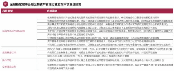 金融稳定理事会方面。作为20国集团为促进金融体系稳定而成立的合作组织,金融稳定理事会的任务是制订和实施促进金融稳定的监管政策和其他政策,解决金融脆弱性问题。为解决资产管理行业的潜在风险,金融稳定理事会自2015年开始陆续开展了多项工作,包括评估资产管理活动的结构性变化,识别可能影响全球金融体系的潜在问题,评估政策在缓释风险方面的作用和功能,制定必要的改进措施等,并于2017年制定了《应对资产管理业务结构脆弱性的政策建议》。在其中,金融稳定理事会定义了四类资产管理行业脆弱性因素:开放式基金所面临的结构性、流动性错配问题;投资基金杠杆;市场压力时期资产管理机构操作风险以及证券借贷业务,并针对性地提出了四大类共计14条风险应对措施(见表1)。同时,金融稳定理事会亦对养老基金和主权财富基金的结构脆弱性问题进行了总结。养老基金的潜在风险主要表现为固定缴费型养老基金的流动性风险、潜在的杠杆累积风险以及长寿风险和衍生品的使用风险;主权财富基金的潜在风险主要为市场集中导致的风险、追求高额回报和流动性风险以及杠杆的监测风险。